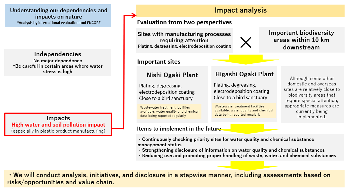 Therefore, we screened all of our group's production sites for those with facilities that have relatively high risk of water pollution, and with important biodiversity-related areas located within approximately 10 km downstream. This screening identified multiple sites in close proximity. However, all sites were found to have appropriate wastewater treatment and other measures in place, and no significant risks were identified at this stage.