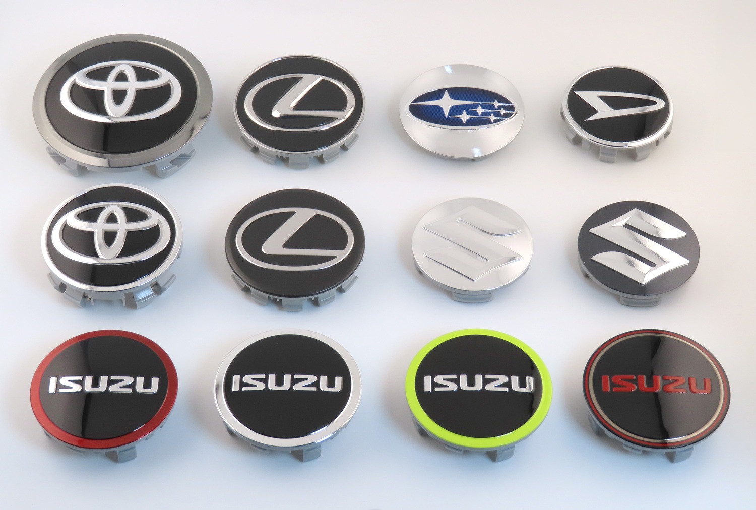 ホイールハブオーナメントは、アルミホイールの中心に装着され、車両ブランドを象徴する外装部品です。インモールド転写工法と塗装の融合により、高い意匠性と耐久性、低コストを実現しています。蒸着とフィルム印刷が生み出す深みある色彩と立体的効果に加え、フィルム柄の変更による多彩なデザイン展開も可能です。