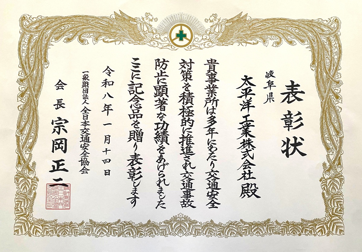 2026年01月16日 サステナビリティ 交通安全国民運動中央大会において「交通安全優良事業所」として表彰を受けました 当社は、1月14日(水)に開催された第66回交通安全国民運動中央大会(主催:一般財団法人 全日本交通安全協会 / 警察庁)において「交通安全優良事業所」の表彰を受けました。 この表彰は、交通安全対策を積極的に推進し、交通事故の防止に顕著な功績をあげた事業所に対して行われるもので、全国から82の事業所が表彰を受けました。 自動車産業に携わる企業として、今後も地域の交通安全に貢献する取り組みを推進してまいります。