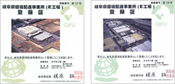当社の北大垣工場と東大垣工場は、地球環境保全対策や緑化等の環境整備に関して優れた取り組みを進めている事業所として、2003年に「岐阜県環境配慮事業所(略称:E工場)」の認定を受け、現在も登録更新を続けています。